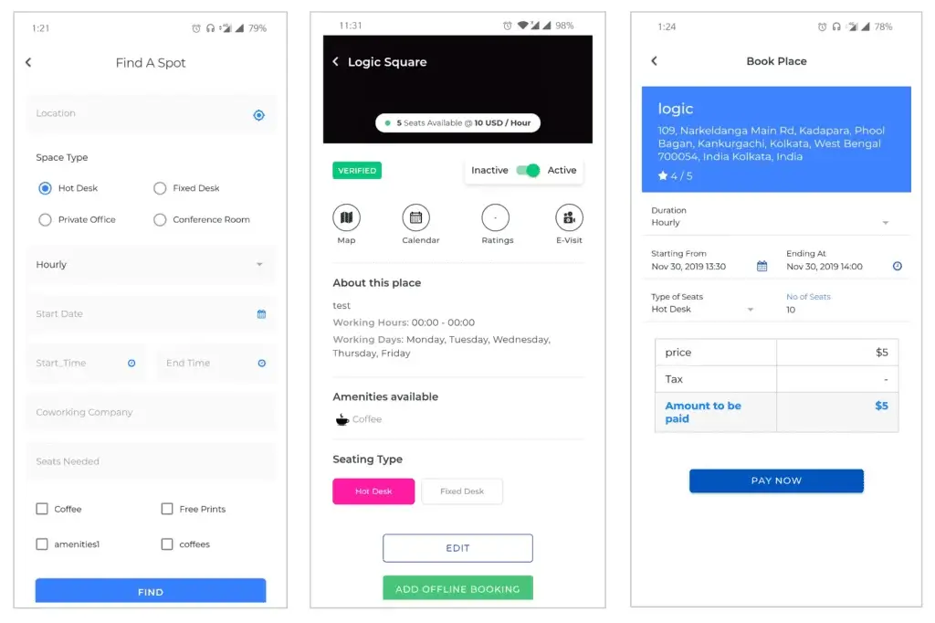 We implemented a system that allows multiple co-working spaces to list their properties and allow renters to book seats at these co-working spaces.