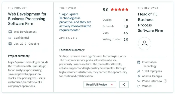 This is just one of the recent recognitions that logic Square Technologies has received. We are honored to receive this recognition. We are devoted to our clients and can’t wait to continue providing our clients with the highest quality service possible. Read more about our services on our TopDevelopers.co profile.